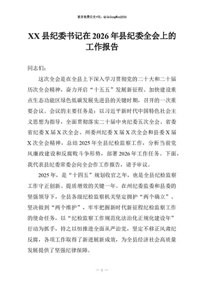 【七哥公文】2026年:XX县纪委书记在2026年县纪委全会上的工作报告+更多免费公文+VX:QiGeGongWen2024