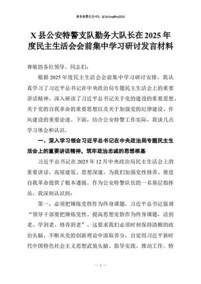 【七哥公文】2026年:X县公安特警支队勤务大队长在2025年度民主生活会会前集中学习研讨发言材料+更多免费公文+VX:QiGeGongWen2024