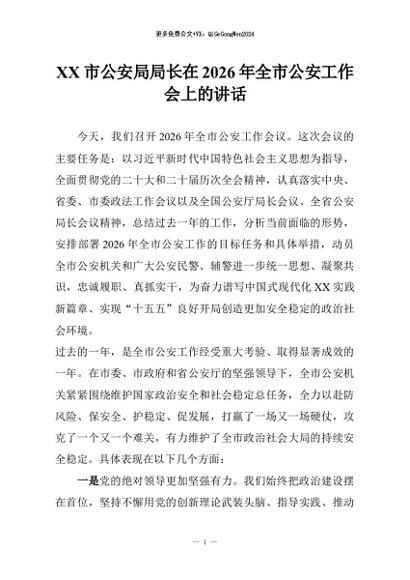 【七哥公文】2026年:XX市公安局局长在2026年全市公安工作会上的讲话+更多免费公文+VX:QiGeGongWen2024