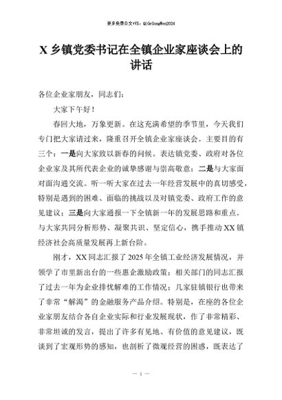 【七哥公文】2026年:X乡镇党委书记在全镇企业家座谈会上的讲话+更多免费公文+VX:QiGeGongWen2024 - 七哥-AI智库