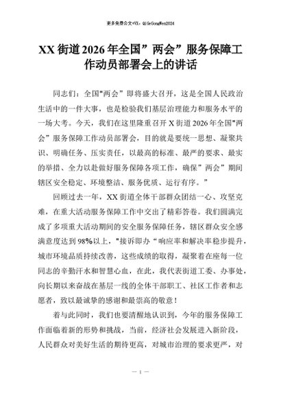 【七哥公文】2026年:XX街道2026年全国”两会”服务保障工作动员部署会上的讲话+更多免费公文+VX:QiGeGongWen2024