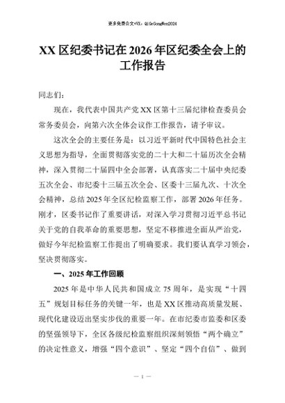 【七哥公文】2026年:XX区纪委书记在2026年区纪委全会上的工作报告+更多免费公文+VX:QiGeGongWen2024