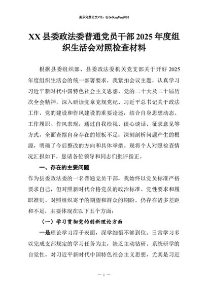 【七哥公文】2026年:XX县委政法委普通党员干部2025年度组织生活会对照检查材料+更多免费公文+VX:QiGeGongWen2024