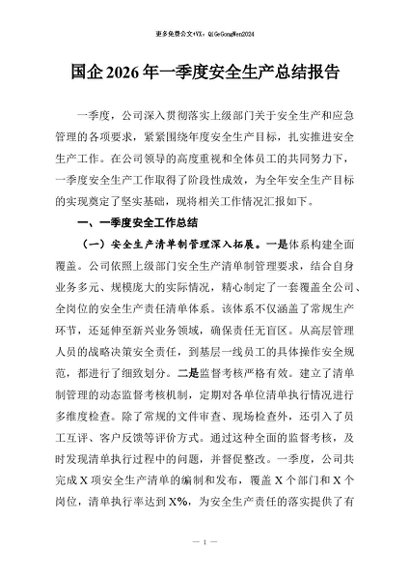 / 【七哥公文】2026年:国企2026年一季度安全生产总结报告+更多免费公文+VX:QiGeGongWen2024