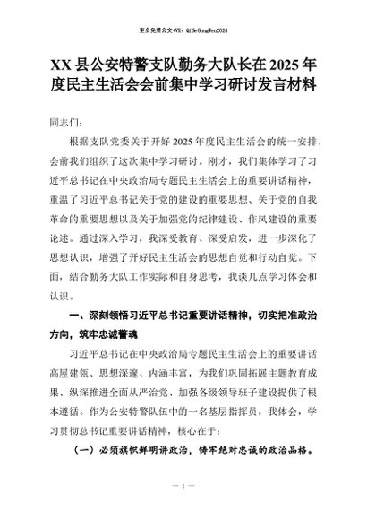 【七哥公文】2026年:XX县公安特警支队勤务大队长在2025年度民主生活会会前集中学习研讨发言材料+更多免费公文+VX:QiGeGongWen2024