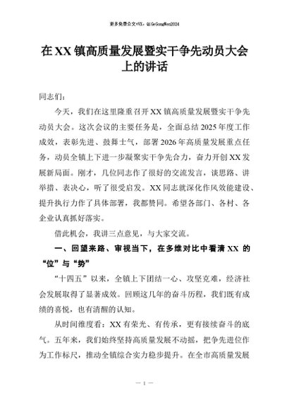 / 【七哥公文】2026年:在XX镇高质量发展暨实干争先动员大会上的讲话+更多免费公文+VX:QiGeGongWen2024
