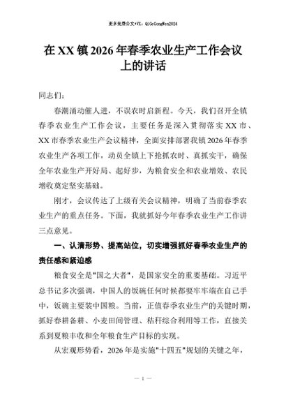 / 【七哥公文】2026年:在XX镇2026年春季农业生产工作会议上的讲话+更多免费公文+VX:QiGeGongWen2024