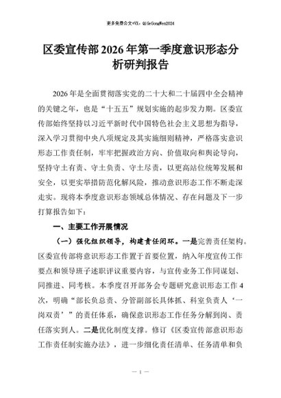 【七哥公文】2026年:区委宣传部2026年第一季度意识形态分析研判报告+更多免费公文+VX:QiGeGongWen2024