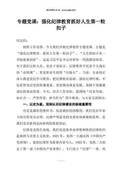【七哥公文】2026年:专题党课:强化纪律教育抓好人生第一粒扣子+更多免费公文+VX:QiGeGongWen2024 - 七哥-AI智库