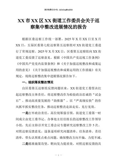 【七哥公文】2026年:XX市XX区XX街道工作委员会关于巡察集中整改进展情况的报告+更多免费公文+VX:QiGeGongWen2024