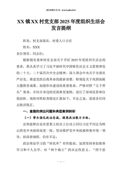 【七哥公文】2026年:XX镇XX村党支部2025年度组织生活会发言提纲+更多免费公文+VX:QiGeGongWen2024