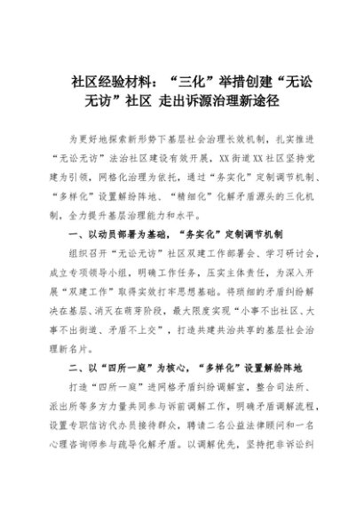 【七哥公文】2025年:社区经验材料:“三化”举措创建“无讼无访”社区 走出诉源治理新途径+更多免费公文+VX:QiGeGongWen2024