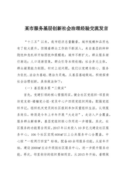 / 【七哥公文】2025年:某市服务基层创新社会治理经验交流发言+更多免费公文+VX:QiGeGongWen2024