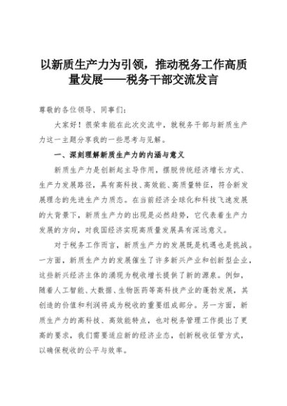 【七哥公文】2025年:以新质生产力为引领,推动税务工作高质量发展——税务干部交流发言+更多免费公文+VX:QiGeGongWen2024