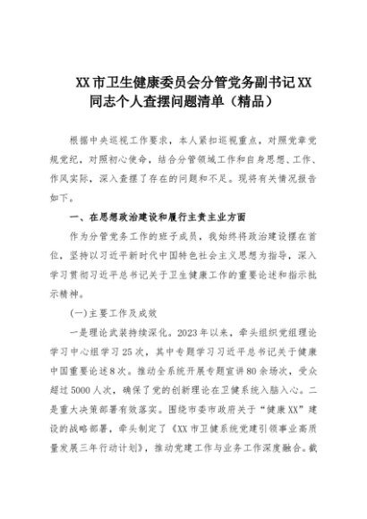 【七哥公文】2025年:XX市卫生健康委员会分管党务副书记XX同志个人查摆问题清单(精品)+更多免费公文+VX:QiGeGongWen2024