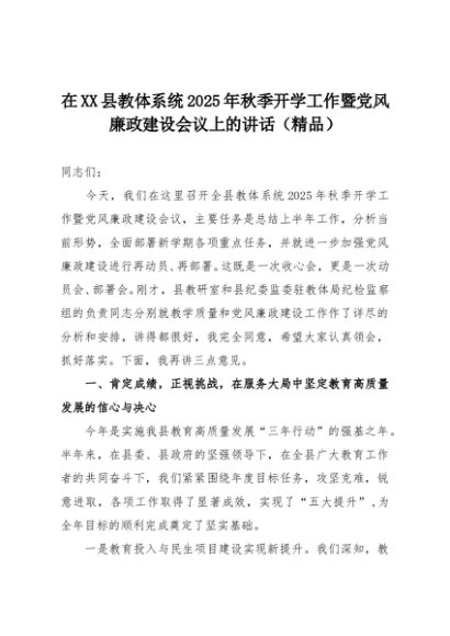 【七哥公文】2025年:在XX县教体系统2025年秋季开学工作暨党风廉政建设会议上的讲话(精品)+更多免费公文+VX:QiGeGongWen2024