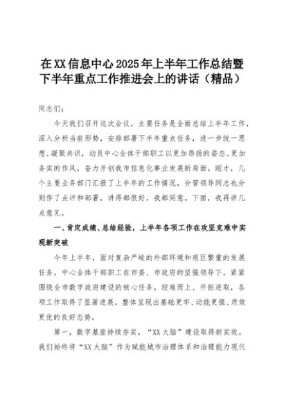 【七哥公文】2025年:在XX信息中心2025年上半年工作总结暨下半年重点工作推进会上的讲话(精品)+更多免费公文+VX:QiGeGongWen2024