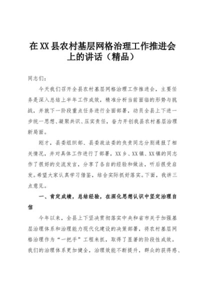 【七哥公文】2025年:在XX县农村基层网格治理工作推进会上的讲话(精品)+更多免费公文+VX:QiGeGongWen2024