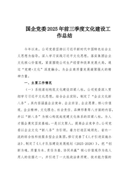 / 【七哥公文】2025年:国企党委2025年前三季度文化建设工作总结+更多免费公文+VX:QiGeGongWen2024
