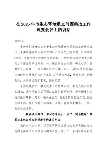【七哥公文】2025年:在2025年市生态环境重点问题整改工作调度会议上的讲话+更多免费公文+VX:QiGeGongWen2024