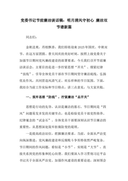 【七哥公文】2025年:党委书记节前廉洁谈话稿:明月清风守初心 廉洁双节谱新篇+更多免费公文+VX:QiGeGongWen2024