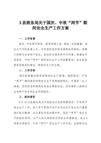 【七哥公文】2025年:X县商务局关于国庆、中秋“两节”期间安全生产工作方案+更多免费公文+VX:QiGeGongWen2024