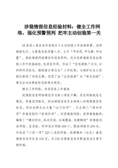 【七哥公文】2025年:涉稳情报信息经验材料:健全工作网络,强化预警预判 把牢主动创稳第一关+更多免费公文+VX:QiGeGongWen2024