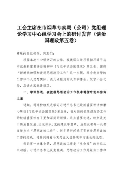 【七哥公文】2025年:工会主席在市烟草专卖局(公司)党组理论学习中心组学习会上的研讨发言(谈治国理政第五卷)+更多免费公文+VX:QiGeGongWen2024