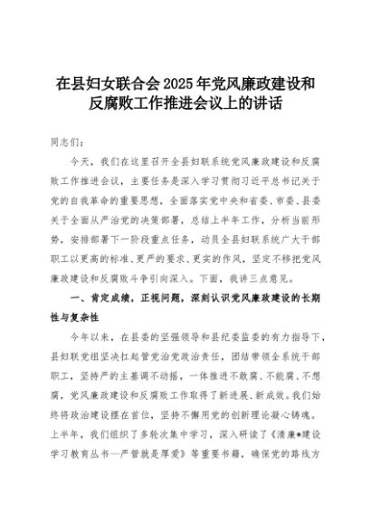 【七哥公文】2025年:在县妇女联合会2025年党风廉政建设和反腐败工作推进会议上的讲话+更多免费公文+VX:QiGeGongWen2024