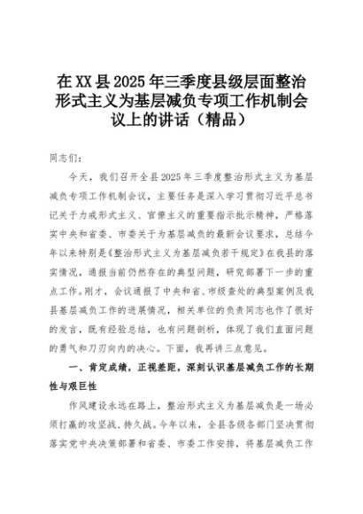【七哥公文】2025年:在XX县2025年三季度县级层面整治形式主义为基层减负专项工作机制会议上的讲话(精品)+更多免费公文+VX:QiGeGongWen2024