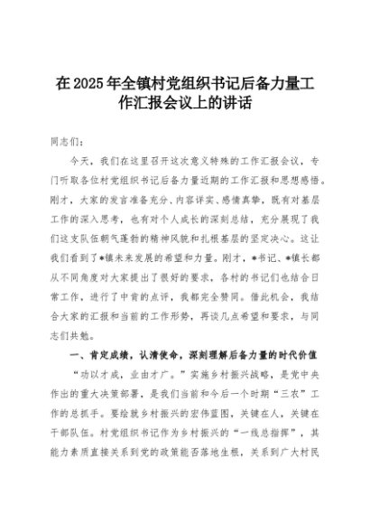【七哥公文】2025年:在2025年全镇村党组织书记后备力量工作汇报会议上的讲话+更多免费公文+VX:QiGeGongWen2024