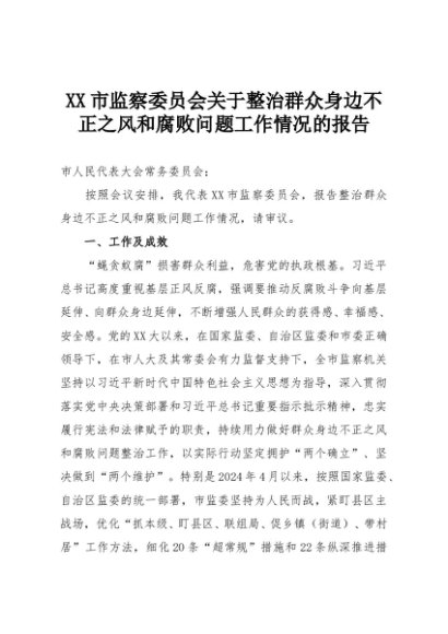 【七哥公文】2025年:XX市监察委员会关于整治群众身边不正之风和腐败问题工作情况的报告+更多免费公文+VX:QiGeGongWen2024