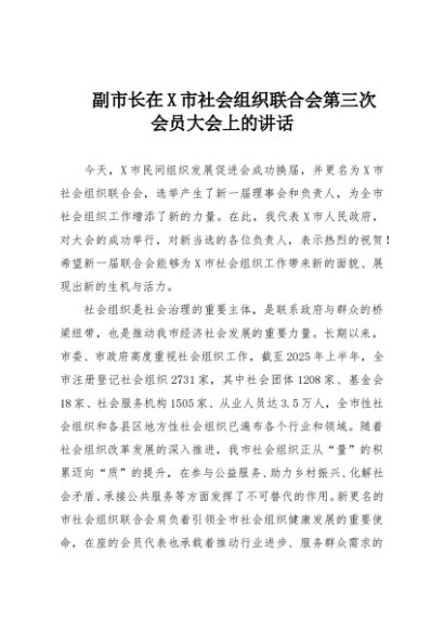 / 【七哥公文】2025年:副市长在X市社会组织联合会第三次会员大会上的讲话+更多免费公文+VX:QiGeGongWen2024