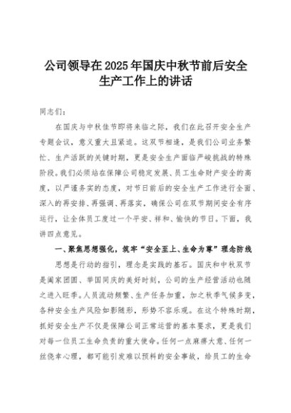 【七哥公文】2025年:公司领导在2025年国庆中秋节前后安全生产工作上的讲话+更多免费公文+VX:QiGeGongWen2024