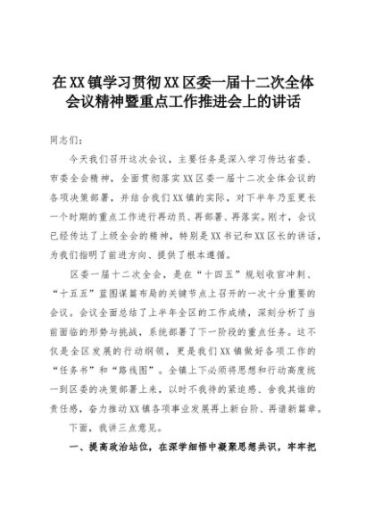 【七哥公文】2025年:在XX镇学习贯彻XX区委一届十二次全体会议精神暨重点工作推进会上的讲话+更多免费公文+VX:QiGeGongWen2024
