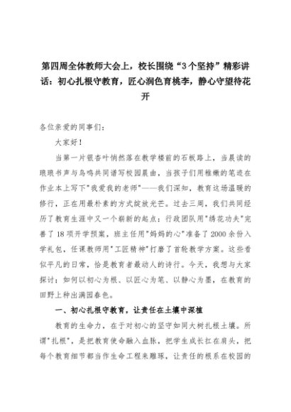 【七哥公文】2025年:第四周全体教师大会上,校长围绕“3个坚持”精彩讲话:初心扎根守教育,匠心润色育桃李,静心守望待花开+更多免费公文+VX:QiGeGongWen2024