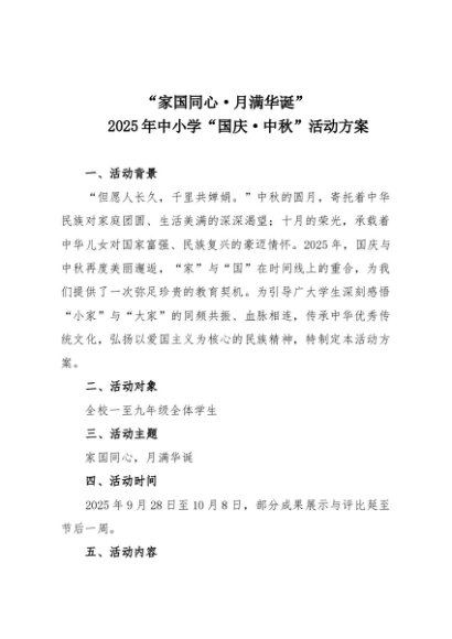 【七哥公文】2025年:“家国同心·月满华诞”2025年中小学“国庆·中秋”活动方案+更多免费公文+VX:QiGeGongWen2024