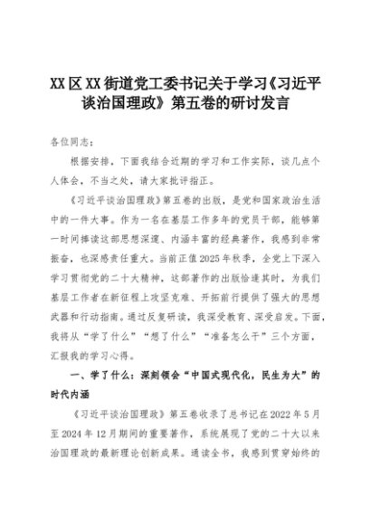 【七哥公文】2025年:XX区XX街道党工委书记关于学习《习近平谈治国理政》第五卷的研讨发言+更多免费公文+VX:QiGeGongWen2024