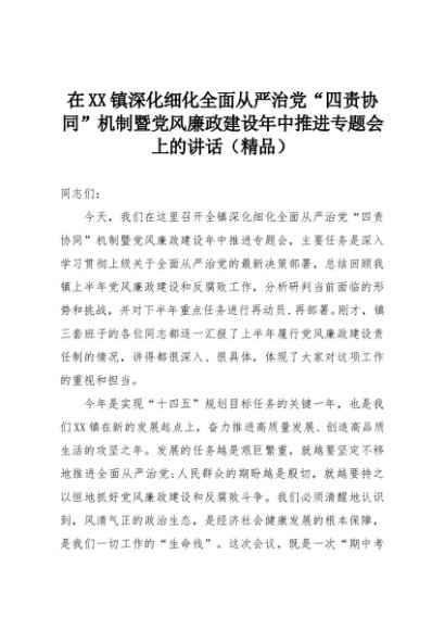 【七哥公文】2025年:在XX镇深化细化全面从严治党“四责协同”机制暨党风廉政建设年中推进专题会上的讲话(精品)+更多免费公文+VX:QiGeGongWen2024