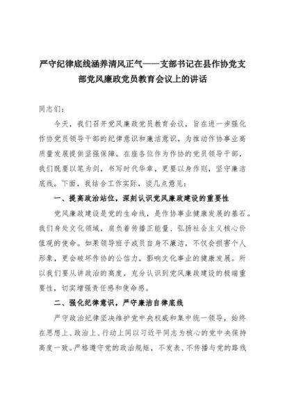 【七哥公文】2025年:严守纪律底线涵养清风正气——支部书记在县作协党支部党风廉政党员教育会议上的讲话+更多免费公文+VX:QiGeGongWen2024