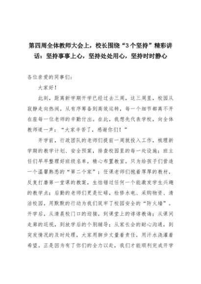 【七哥公文】2025年:第四周全体教师大会上,校长围绕“3个坚持”精彩讲话:坚持事事上心,坚持处处用心,坚持时时静心+更多免费公文+VX:QiGeGongWen2024