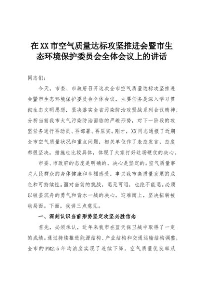 【七哥公文】2025年:在XX市空气质量达标攻坚推进会暨市生态环境保护委员会全体会议上的讲话+更多免费公文+VX:QiGeGongWen2024