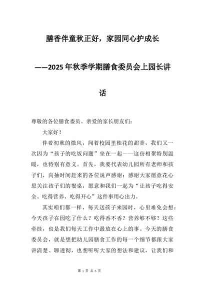 【七哥公文】2025年:2025年秋季学期膳食委员会上园长讲话:膳香伴童秋正好,家园同心护成长+更多免费公文+VX:QiGeGongWen2024