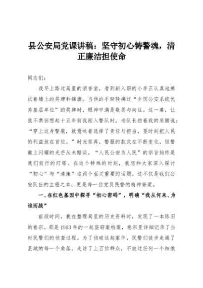 / 【七哥公文】2025年:县公安局党课讲稿:坚守初心铸警魂,清正廉洁担使命+更多免费公文+VX:QiGeGongWen2024