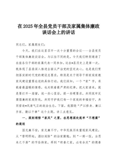 【七哥公文】2025年:在2025年全县党员干部及家属集体廉政谈话会上的讲话+更多免费公文+VX:QiGeGongWen2024