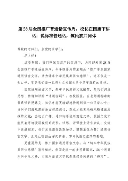 【七哥公文】2025年:第28届全国推广普通话宣传周,校长在国旗下讲话:说标准普通话,筑民族共同体+更多免费公文+VX:QiGeGongWen2024