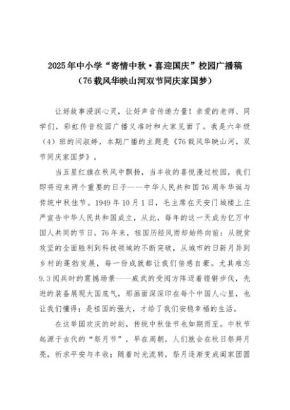 【七哥公文】2025年:2025年中小学“寄情中秋·喜迎国庆”校园广播稿(76载风华映山河双节同庆家国梦)+更多免费公文+VX:QiGeGongWen2024