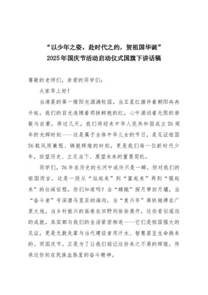 【七哥公文】2025年:“以少年之姿,赴时代之约,贺祖国华诞”2025年国庆节活动启动仪式国旗下讲话稿+更多免费公文+VX:QiGeGongWen2024