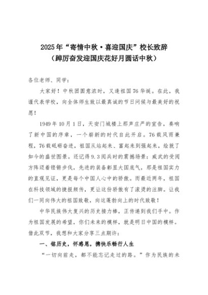 【七哥公文】2025年:2025年“寄情中秋·喜迎国庆”校长致辞(踔厉奋发迎国庆花好月圆话中秋)+更多免费公文+VX:QiGeGongWen2024