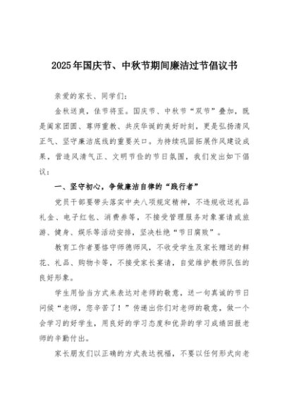 【七哥公文】2025年:2025年国庆节、中秋节期间廉洁过节倡议书+更多免费公文+VX:QiGeGongWen2024